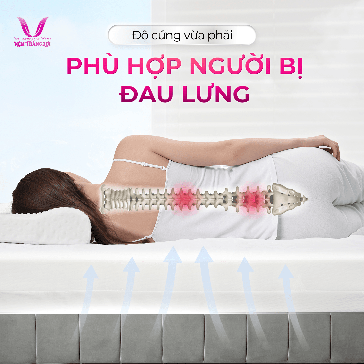 - Thuyên giảm tình trạng đau xương khớp/ cột sống khi nằm: Nệm Cao Su Foam Cao Cấp Thắng Lợi cung cấp sự nâng đỡ ổn định cho cơ thể bạn suốt đêm. Khả năng nâng đỡ bền vững giúp duy trì tư thế nằm đúng, bảo vệ cột sống và giảm thiểu các vấn đề về đau lưng và mỏi cổ. Bạn sẽ có một giấc ngủ sâu và thư giãn.