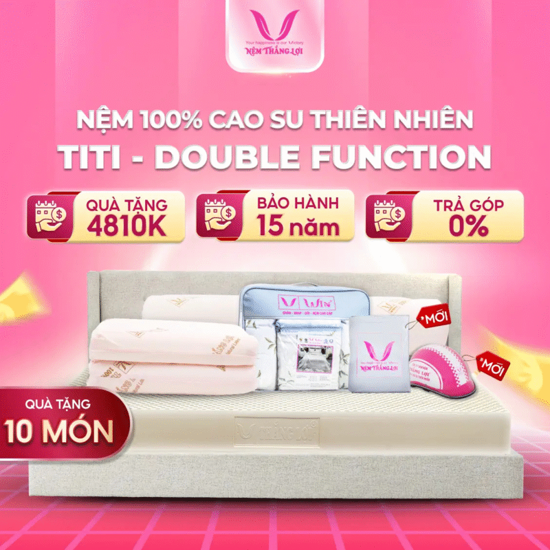 | Chất liệu | Chất liệu nệm cao su thiên nhiên Thắng Lợi TiTi – Double Function được sản xuất hoàn toàn 100% cao su thiên nhiên. |