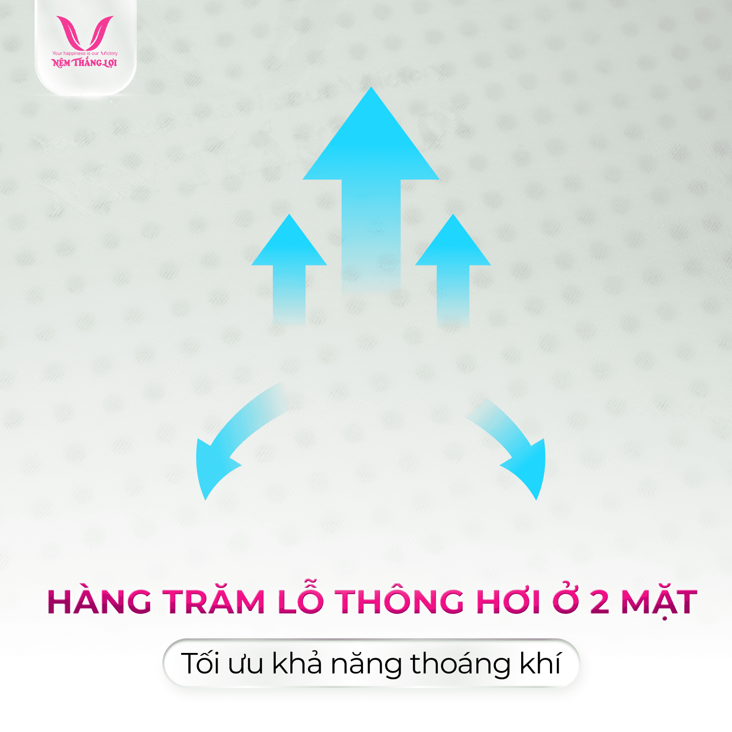 Điểm nổi bật của nệm là hệ thống hàng trăm lỗ thông hơi ở cả hai mặt, giúp tối ưu hoá khả năng thoáng khí. Hệ thống này không chỉ mang lại sự mát mẻ, dễ chịu mà còn hạn chế ẩm mốc, đảm bảo không gian ngủ luôn sạch sẽ và trong lành.